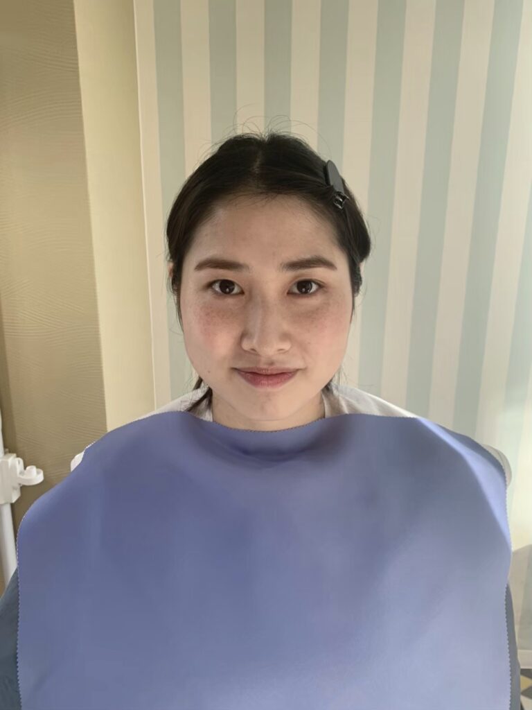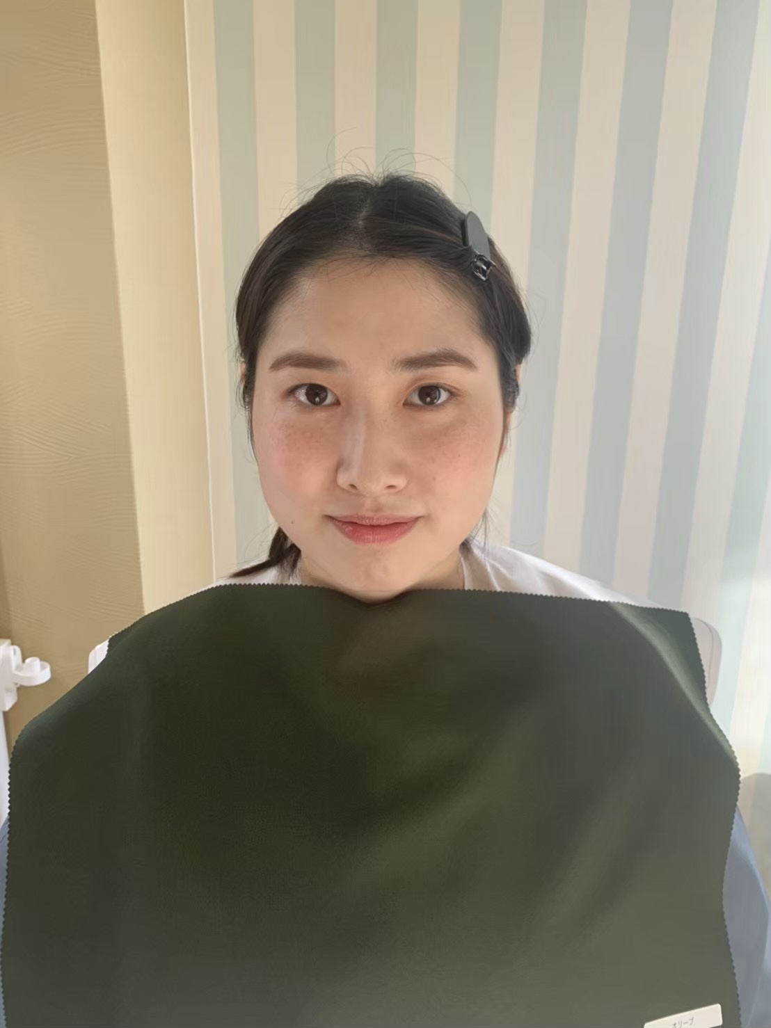 イエローベース秋のオリーブをあてると、お肌に黄色みが足されたり、お顔立ちが少し平面的に見えます。
